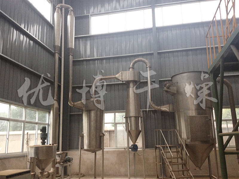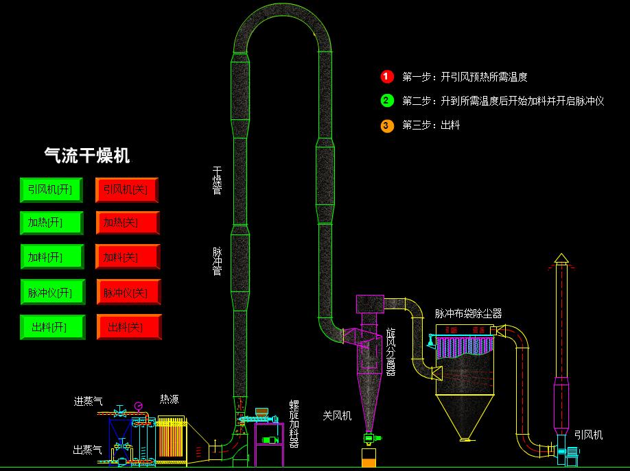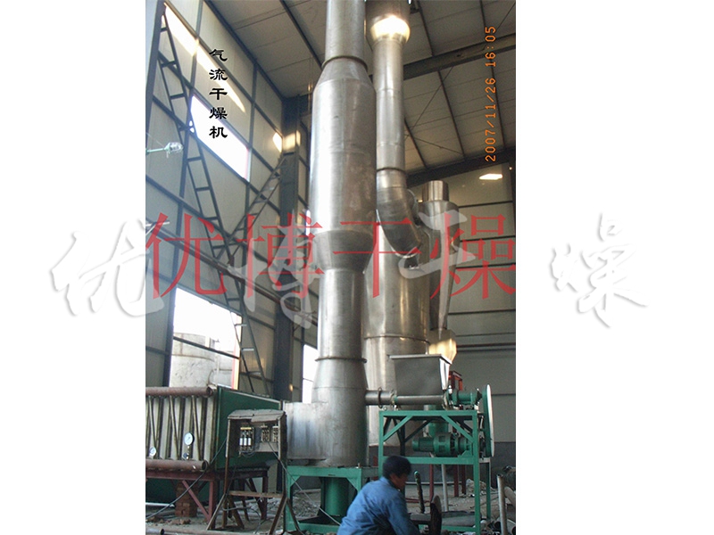 上述这类物料具有特殊性:比重轻,加料难,易燃,易爆。针对此情况,我公司技术部门开发研制的新型气流干燥机,在原气流干燥机的基础上改进了加料形式,解决了“架桥”现象。创新改进了旋风分离器,解决了物料翻滚不出料的现象。系统集成,控制先进,超温报警连锁关闭热源,有效解决了温度过高引起的燃烧爆炸问题。