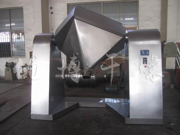 将物料装入方锥形密闭混合桶内,料斗对称的轴线与回转轴轴线成一夹角,不同组分物料在密闭的料斗中进行三维空间运动,产生强烈翻转和扩散收缩作用,达到混合效果。